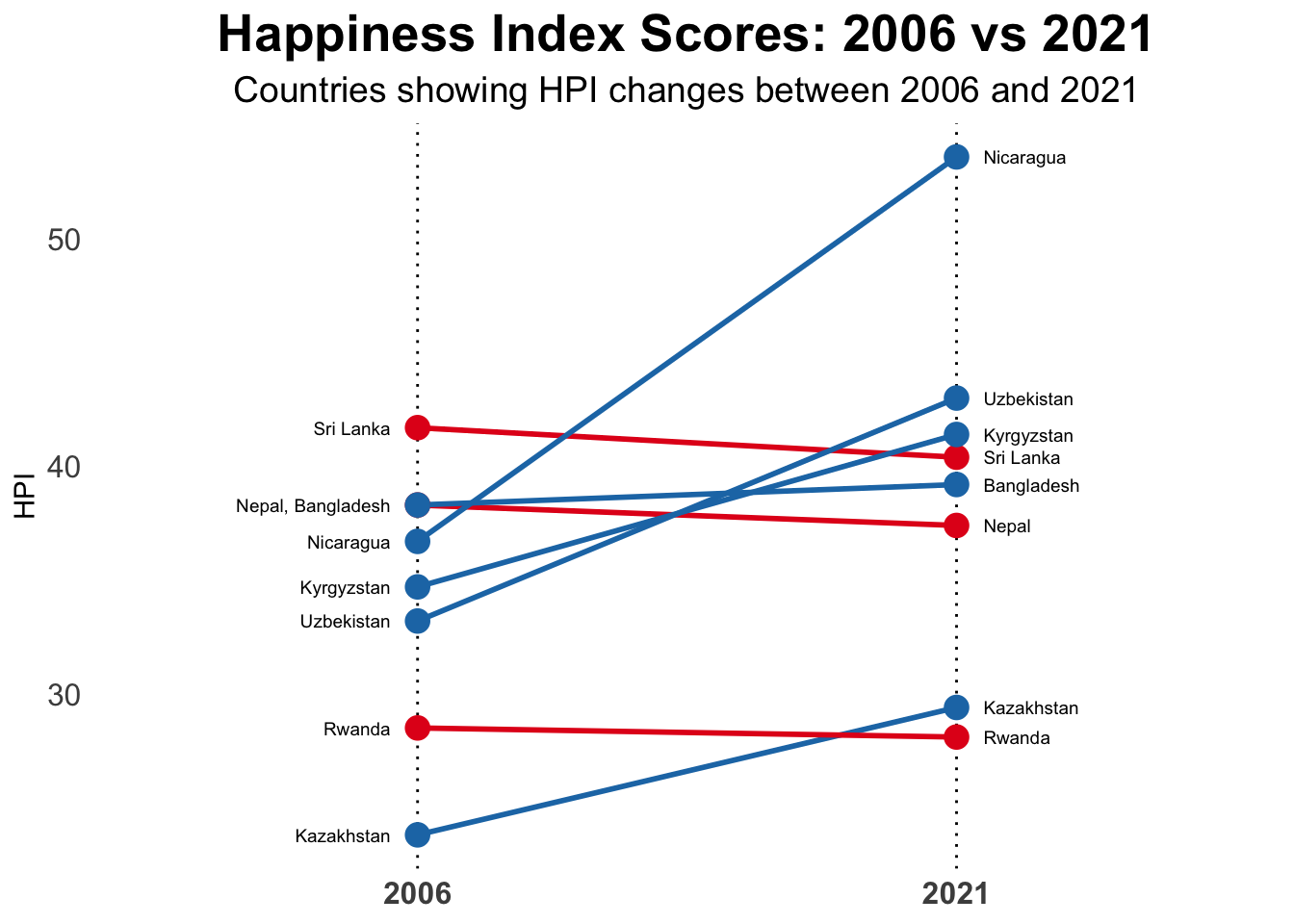 The graph effectively highlights disparities in progress between 2006 and 2021. Countries like Nicaragua show significant improvement, with the highest increase in HPI, indicating progress in happiness. Nepal, and Sri Lanka remain relatively stable, indicating limited change. On the other hand, Rwanda and Kazakhstan show noticeable declines in HPI, reflecting potential challenges in maintaining life satisfaction. It gives us insights on further investigate on how countries like Nicaragua manage to improve its HPI.
