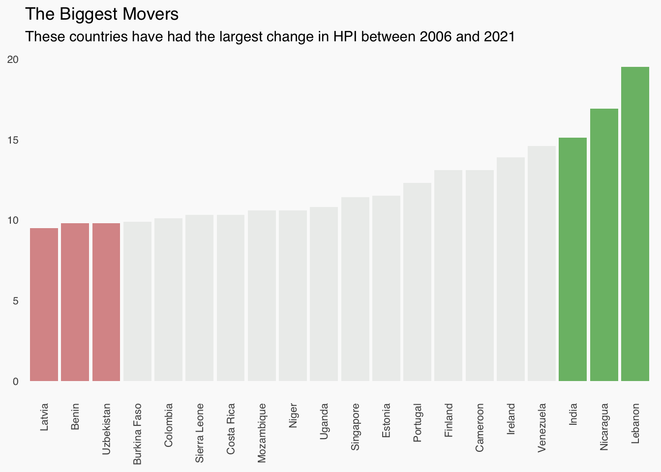 This bar chart displays the top 20 countries with the largest changes in their Happy Planet Index (HPI) between 2006 and 2021, with green bars representing increases and red bars representing decreases. The countries with the most significant positive changes include Lebanon, Nicaragua, and India, while the most substantial negative changes are observed in Latvia, Benin, and Uzbekistan. From this plot, we can clearly see that HPI movements can vary a lot for different countries.