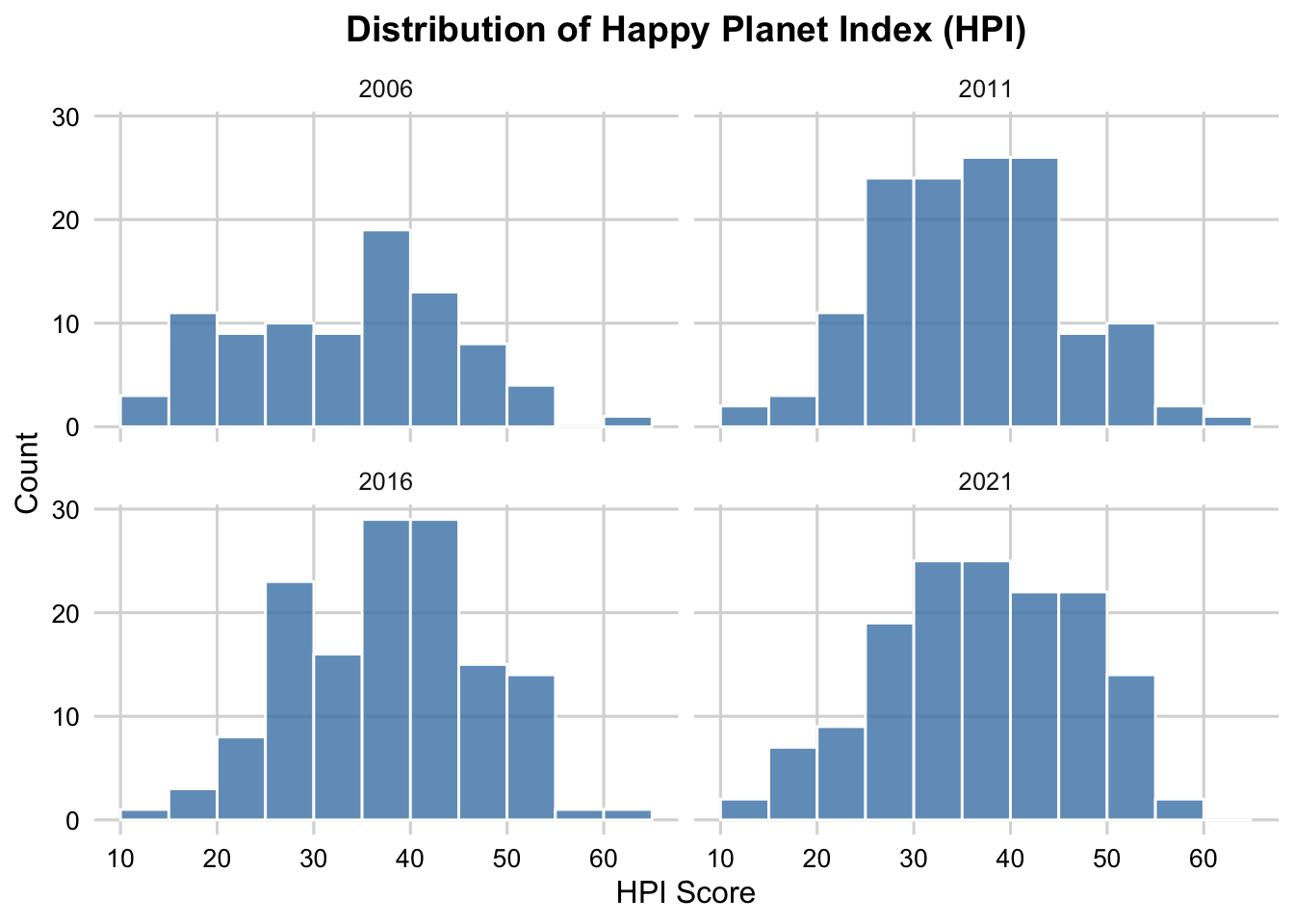 The data reveals notable variability in HPI scores across the years. In 2006, the distribution is slightly right-skewed, with a noticeable peak around 30-40. By 2011, the distribution becomes more symmetrical, with most scores concentrated between 30 and 50. In 2016, the distribution shifts slightly upward, showing a higher concentration in the range of 35-50. However, in 2021, the distribution shifts downward, with most scores falling between 25 and 50.
