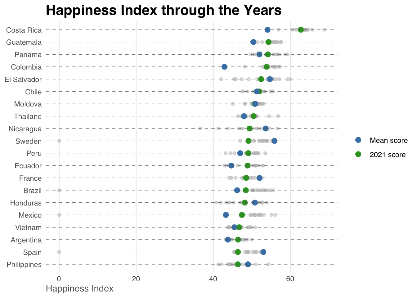 past_HPI$Mean_HPI <-rowMeans(past_HPI[, 2:17], na.rm =TRUE)past_HPI_long <- past_HPI %>%pivot_longer(cols =`2006`:`2021`, names_to ="Year", values_to ="HPI") %>%mutate(Year =as.numeric(gsub("HPI_", "", Year))) top_countries <- past_HPI %>%arrange(desc(Mean_HPI)) %>%head(20) %>%arrange(Mean_HPI)past_HPI_long <- past_HPI_long %>%filter(Country %in% top_countries$Country)ggplot(data = past_HPI_long, aes(x = HPI, y =reorder(Country, Mean_HPI))) +geom_point(color ="gray", size =1.5, alpha =0.5) +geom_point(data = top_countries, aes(x = Mean_HPI, y =reorder(Country, Mean_HPI), color ="Mean score"),size =3, shape =16) +geom_point(data =filter(past_HPI_long, Year ==2021),aes(x = HPI, y = Country, color ="2021 score"), size =3, shape =16) +geom_hline(yintercept =seq_along(top_countries$Country), color ="gray40", linetype ="dashed", size =0.2) +labs(title ="Happiness Index through the Years",x ="Happiness Index", y =NULL, color =NULL) +scale_color_manual(values =c("Mean score"="#33a02c", "2021 score"="#4682B4"),labels =c("Mean score", "2021 score") ) +theme_minimal(base_family ="sans") +theme(panel.grid.major.y =element_blank(),panel.grid.minor =element_blank(),axis.text.y =element_text(hjust =1, color ="gray40"),axis.title.x =element_text(hjust =0, color ="gray40"),plot.title =element_text(size =17, face ="bold"),plot.subtitle =element_text(size =12, color ="gray40"),legend.position ="right" )