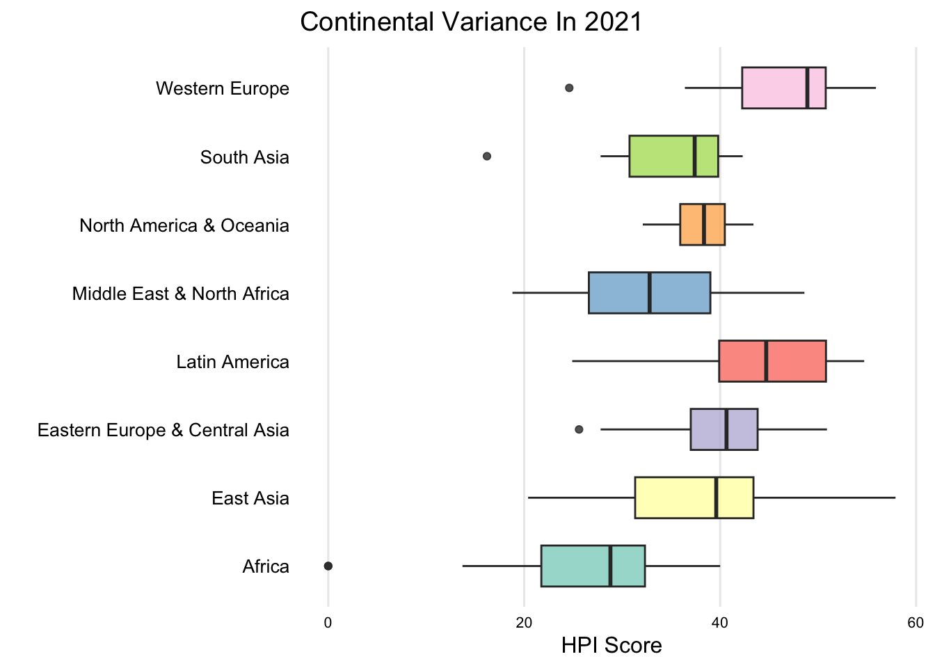 library(RColorBrewer)continent_mapping <-c("Latin America","North America & Oceania","Western Europe","Middle East & North Africa","Africa","South Asia","Eastern Europe & Central Asia","East Asia")hpi_2021$ContinentName <- continent_mapping[hpi_2021$Continent]qualitative_palette <-brewer.pal(n =length(unique(hpi_2021$ContinentName)), "Set3")ggplot(hpi_2021, aes(x = HPI, y = ContinentName, fill = ContinentName)) +geom_boxplot(width =0.6, alpha =0.8) +scale_fill_manual(values = qualitative_palette) +theme_minimal(base_size =12) +theme(panel.grid.major.y =element_blank(),panel.grid.minor =element_blank(),axis.text.y =element_text(size =10, color ="black"),axis.text.x =element_text(size =8, color ="black"),legend.position ="none",panel.border =element_blank(),axis.line =element_blank() ) +labs(title ="Continental Variance In 2021",x ="HPI Score",y ="" )
