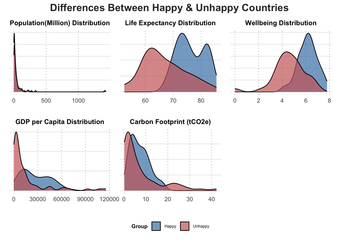 library(gridExtra)library(grid) library(patchwork)#Split Data Based on Average HPIhpi_avg <-mean(hpi_2024$HPI, na.rm =TRUE) # Calculate average HPIhpi_2024 <- hpi_2024 %>%mutate(Lower_Happy =ifelse(HPI < hpi_avg, "Unhappy", "Happy")) # Add split columnhpi_2024$Population <- hpi_2024$`Population (thousands)`/1e3variables <-c("Population","Life Expectancy (years)","Ladder of life (Wellbeing) (0-10)","GDP per capita ($)","Carbon Footprint (tCO2e)")titles <-c("Population(Million) Distribution","Life Expectancy Distribution","Wellbeing Distribution","GDP per Capita Distribution","Carbon Footprint (tCO2e)")plot_list <-lapply(seq_along(variables), function(i) { var <- variables[i] ggplot(hpi_2024, aes_string(x =paste0("`", var, "`"), fill ="Lower_Happy")) +geom_density(alpha =0.7, color ="black") +scale_fill_manual(values =c("#4682B4", "#CC6666")) +# Customize colorslabs(x = var, y =NULL, fill ="Group", title = titles[i]) +# Add plot titletheme_minimal() +theme(axis.text.y =element_blank(),axis.ticks.y =element_blank(),panel.grid.major.x =element_line(color ="gray", linetype ="dotted"),panel.grid.minor =element_blank(),axis.title.x =element_text(size =10, face ="bold", family ="monospace"),plot.title =element_text(size =10, face ="bold", hjust =0.5), legend.position ="bottom",legend.title =element_text(size =8, face ="bold"), legend.text =element_text(size =6), legend.key.size =unit(0.5, "cm") )})combined_plot <-wrap_plots(plot_list, ncol =3) +plot_layout(guides ="collect") +# Collect a single shared legendplot_annotation(title ="Differences Between Happy & Unhappy Countries",theme =theme(plot.title =element_text(size =15, face ="bold", hjust =0.5, color ="#323232"),plot.subtitle =element_text(size =12, face ="italic", hjust =0.5, color ="gray"),legend.position ="bottom" ) )# Print the final combined plotprint(combined_plot)