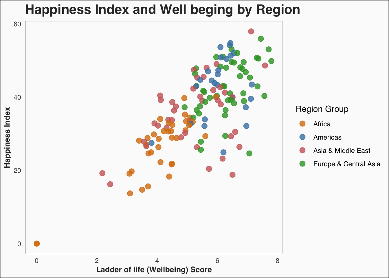 hpi_2024 <- hpi_2024 %>%mutate(Region_Group =case_when( Continent %in%c(1, 2) ~"Americas", # Latin America, N. America & Oceania Continent %in%c(3, 7) ~"Europe & Central Asia", # Western Europe, Eastern Europe & Central Asia Continent %in%c(4, 6, 8) ~"Asia & Middle East", # Middle East, South Asia, East Asia Continent ==5~"Africa", # Africa ))ggplot(hpi_2024, aes(x =`Ladder of life (Wellbeing) (0-10)`,y = HPI, color = Region_Group )) +geom_point(size =3, alpha =0.8) +labs(title ="Happiness Index and Well beging by Region",x ="Ladder of life (Wellbeing) Score",y ="Happiness Index",color ="Region Group" ) +scale_color_manual(values =c("Americas"="#4682B4","Europe & Central Asia"="#33a02c","Asia & Middle East"="#CC6666","Africa"="#D97D0D" ) ) +# Customize the themetheme_minimal(base_family ="sans") +theme(panel.grid.major =element_blank(),panel.grid.minor =element_blank(),panel.background =element_rect(fill ="#fbfbfb"),plot.background =element_rect(fill ="#fbfbfb"),plot.title =element_text(size =17, face ="bold", color ="#323232"),plot.subtitle =element_text(size =12, face ="italic", color ="gray40"),axis.title.x =element_text(size =10, face ="bold", color ="#323232"), # Removed `family`axis.title.y =element_text(size =10, face ="bold", color ="#323232"),legend.position ="right",legend.background =element_blank(),legend.box.background =element_rect(fill ="transparent", color =NA) )