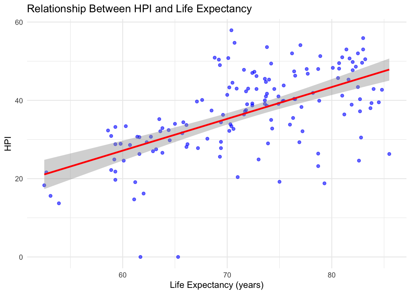 hpi_2024 <- hpi_2024 %>%rename(HPI =`HPI`, # Keep HPI column nameLife_Expectancy =`Life Expectancy (years)` ) %>%mutate(HPI =as.numeric(HPI), Life_Expectancy =as.numeric(Life_Expectancy) )# Remove rows with missing datahpi_clean <- hpi_2024 %>%filter(!is.na(HPI), !is.na(Life_Expectancy))model <-lm(HPI ~ Life_Expectancy, data = hpi_clean)ggplot(hpi_clean, aes(x = Life_Expectancy, y = HPI)) +geom_point(color ="blue", alpha =0.6) +geom_smooth(method ="lm", color ="red", se =TRUE) +labs(title ="Relationship Between HPI and Life Expectancy",x ="Life Expectancy (years)",y ="HPI" ) +theme_minimal()