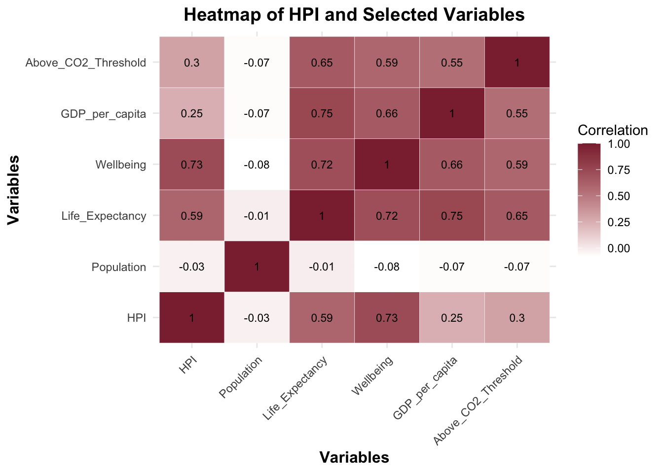 hpi_2024 <- hpi_2024 %>%mutate(Above_CO2_Threshold =ifelse(`Carbon Footprint (tCO2e)`>`CO2 threshold for year (tCO2e)`, 1, 0 ) )heatmap_data <- hpi_2024 %>%select( HPI,Population =`Population (thousands)`, Life_Expectancy,Wellbeing =`Ladder of life (Wellbeing) (0-10)`,GDP_per_capita =`GDP per capita ($)`, Above_CO2_Threshold )# Ensure numeric columns for correlation (convert boolean if needed)heatmap_data$Above_CO2_Threshold <-as.numeric(heatmap_data$Above_CO2_Threshold)# Compute the correlation matrixcor_matrix <-cor(heatmap_data, use ="complete.obs")# Melt the correlation matrix for ggplotmelted_cor_matrix <-melt(cor_matrix)# Create the heatmapggplot(data = melted_cor_matrix, aes(x = Var1, y = Var2, fill = value)) +geom_tile(color ="white") +geom_text(aes(label =round(value, 2)), color ="black", size =3) +# Add correlation valuesscale_fill_gradient(low ="white", high ="#8C2B3D", name ="Correlation") +labs(title ="Heatmap of HPI and Selected Variables",x ="Variables",y ="Variables" ) +theme_minimal() +theme(axis.text.x =element_text(angle =45, vjust =1, hjust =1),axis.title =element_text(size =12, face ="bold"),plot.title =element_text(size =14, face ="bold", hjust =0.5) )