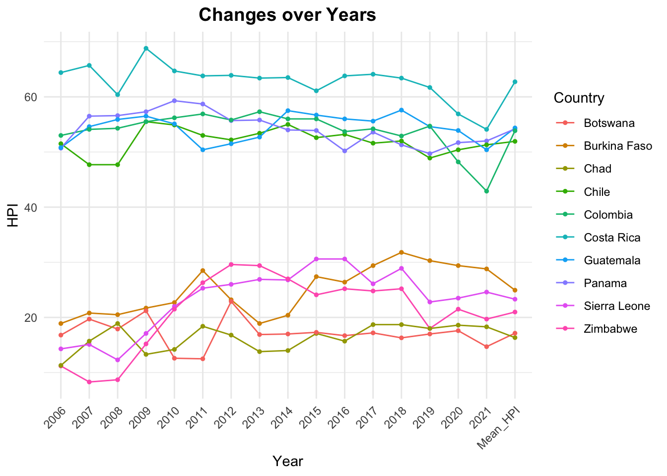This plot highlights the consistent differences in well-being among countries over time. High-performing nations like Costa Rica and Colombia consistently maintain scores above 50, reflecting stability and progress, while countries like Zimbabwe, and Chad struggle with scores below 30. These variations point to disparities in economic, social, or environmental conditions. Notably, the high-performing countries exhibit remarkable stability, while lower-ranking nations experience more volatility, suggesting vulnerabilities to external or internal challenges. These trends underscore the need for targeted efforts to support struggling countries and sustain progress in happy ones.